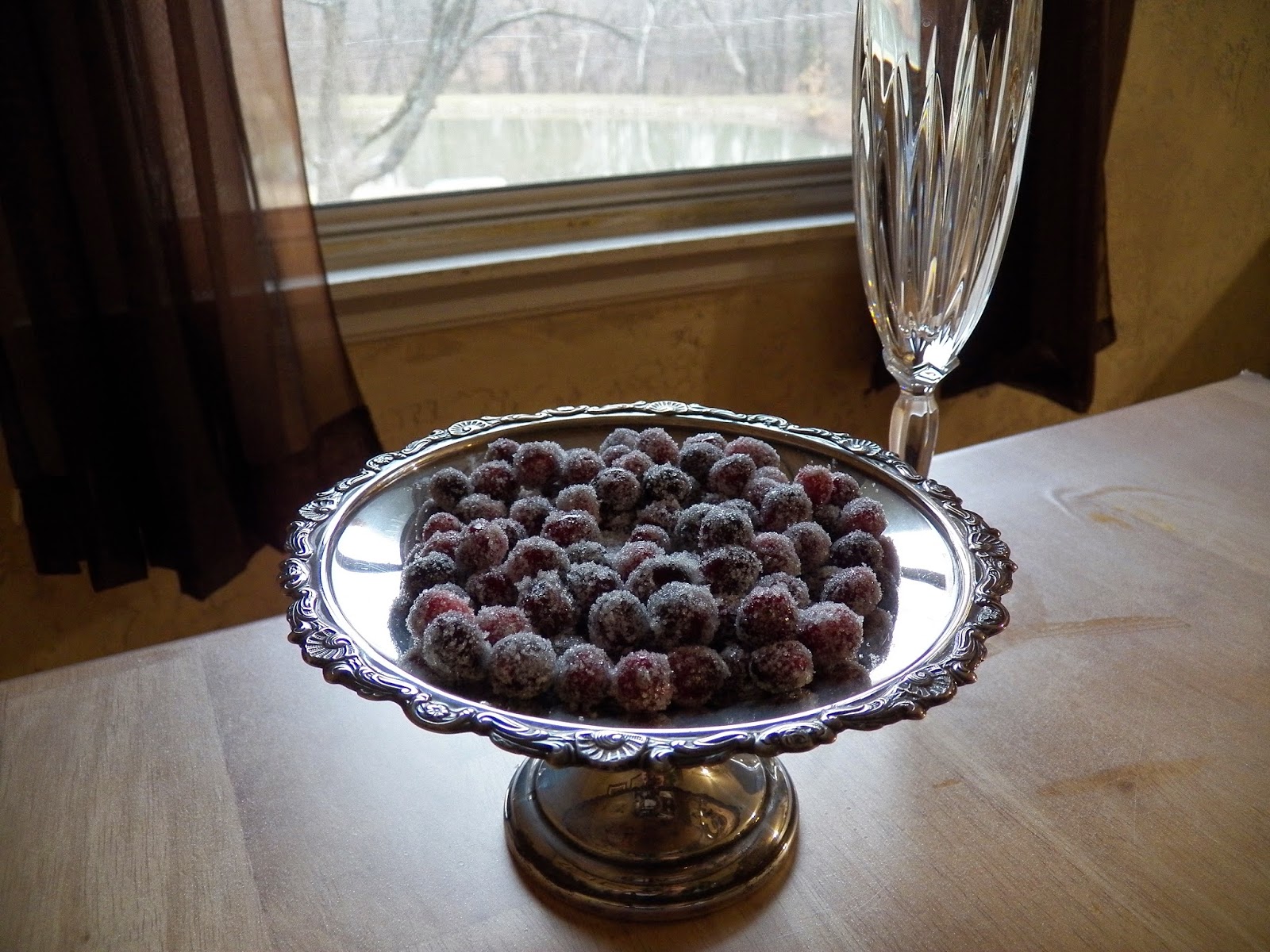 Heat sugar and water in a pot until sugar is dissolved (try not to boil, but if you do, the world probably won't end; you just don't want to hard candy your syrup). Then let that cool (if you put the cranberries in when it's hot, they'll pop open). After it's cooled, add cranberries. You're going to leave them in this sugar water to soak overnight, so be sure they're all submerged. This will keep your cranberries from being intensely sour--they'll still be a bit sour, mind you, but not as sour as plain old cranberries rolled in sugar would have been.